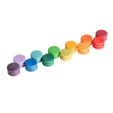 The possibilities of play with these simple coin shaped wooden pieces are endless: they are perfect for some Montessori work, such as colour sorting, posting, matching or counting activities. But combined with other natural materials or Grapat sets – they are also beautiful addition to any open-ended play. They can be play money one moment, a bowl of pasta the next – or whatever your child imagines them to be!