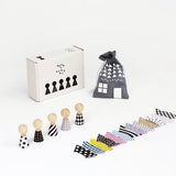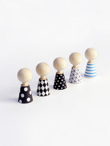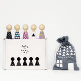 Modern Pebbles wooden dolls with the best wardrobe are lots of dress-up fun with easy stick-on & reusable clothes. The set includes 5 solid maple dolls in a cotton bag 36 bold & chic paper clothes with contemporary patterns in monochrome and basic colors