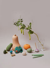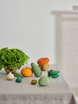 These beautiful vegetables are perfect for pretend play. The play set contains: zucchini, garlic, pumpkin, broccoli, artichoke, olives, asparagus, avocado and cotton bag for storage.
