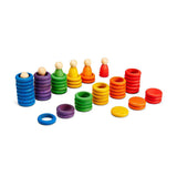It includes 6 Nins, or peg people (1 of each colour), 36 rings (6 of each colour) and 18 coins (3 of each colour). The included colours are purple, blue, green, yellow, orange and red.