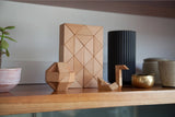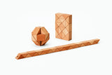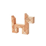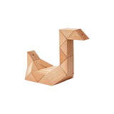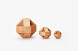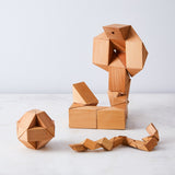 Twist and turn these blocks to create serpentine shapes and geometric patterns. Snake Blocks are composed of 24 wooden triangles with an elastic band throughout.