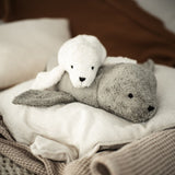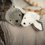 Small cuddly white seal by Senger Naturwelt. The perfect soft cuddly toy for your child as well as warming pillow. Made of organic cotton outer with pure lambswool filling. The belly has a zipper compartment with a pillow filled with cherrystones, which can be warmed or cooled. An heirloom quality soft toy and best friend for life!