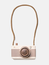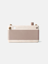 Made in reassuringly solid rubberwood, with the zoom feature inlaid in Sapele teak wood, the camera is wrapped in Cat's Paw Pink leather for little fingers to grip, with a cotton safety strap for easy carrying. Size: 12 x 6,7 x 7cm