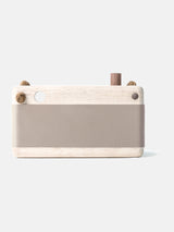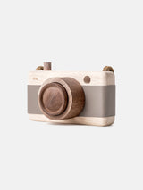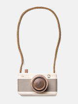 Made in reassuringly solid rubberwood, with the zoom feature inlaid in Sapele teak wood, the camera is wrapped in River Pebble Grey leather for little fingers to grip, with a cotton safety strap for easy carrying. Size: 12 x 6,7 x 7cm
