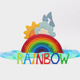 The beautiful shape and feel of the play pieces stimulate the child’s imagination and stories about the weather can be experienced and emulated. Representing the sun, wind, snow, lightning, rain, light, and heavy cloud, all shaped to fit on the curved natural wood display block or Grimm's large twelve pieces Rainbows.