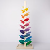 Beautiful, musical rainbow marble tree. Release the marbles at the top of the tree and watch as your marble skips from one leaf to the next creating a magical sound. Each wooden leaf produces a different musical note. The sounds are soothing and the movement of the marbles mesmerising. This heirloom toy encourages eye-hand coordination and teaches cause and effect. Includes 6 colourful marbles
