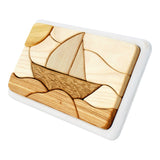 Each puzzle is completely handmade, with each puzzle piece being cut, sanded and finished by hand with very few tools used. The pieces are then coated in linseed oil which enhances the natural colours and patterns of the different wood species used, which are oak, hornbeam, maple, ash and cherry wood.