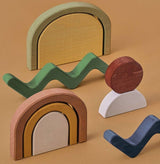 This building set features 9 different shapes in natural earth tones - terracotta, clay, olive, beige, burgundy, pink, forest and deep blue. Perfect for imaginative play as well as a decor piece for the home.